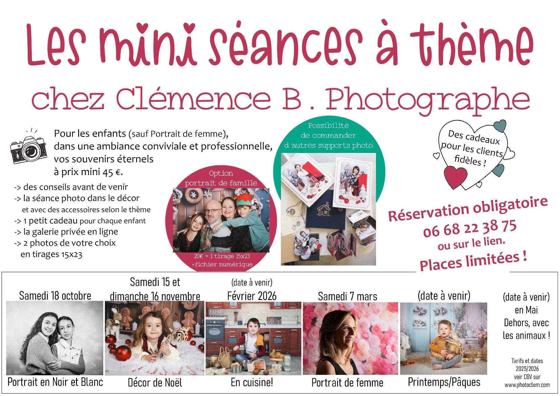 18/10 portraits Noir et Blanc 15 et 16/11 Noël Afin de valider votre réservation, vous devez régler la prestation et accepter les CGV envoyés par mail. Pour un paiement hors ligne me contacter: 0668223875 EN CAS DE PROBLEME CONTACTEZ-MOI